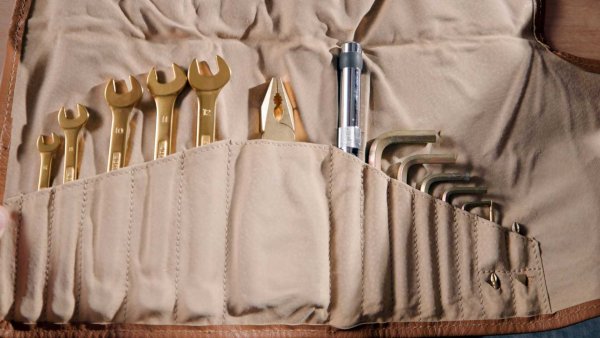 В оборудването са и редките часовници TAG Heuer и комплект от инструменти от титаниев цвят в златист цвят. Има и сандък с инструменти FACOM с нарязана пяна, предлагащ място за всяко парче. Дори гумите са оригинали - Goodyear Eagle F1