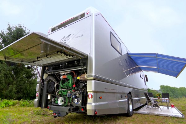 В случая, може да вземете на къмпинга своето любимо Bugatti (не вярвам някой да го стори, но все пак) в специален гараж в долната част на кемпера, който се отваря и прибира посредством хидравлика със специална платформа. Трябва само да закарате колата си на платформата и тя ще се премести в "трюма" на сигурно място.