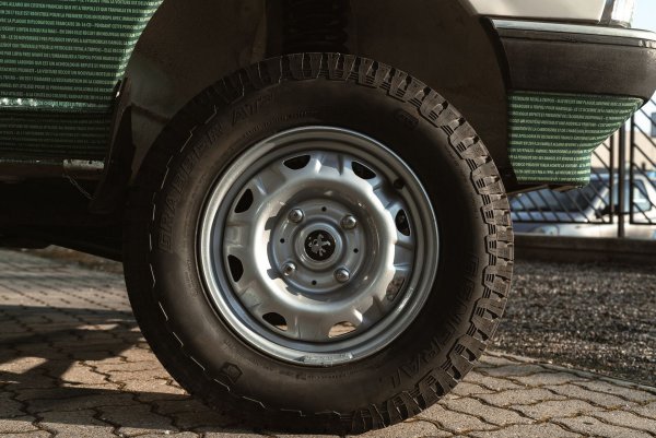 Този конкретен екземпляр няма пластмасови калници. Не е известно дали са премахнати от собственика или просто не са били част от оригиналното оборудване. В същото време на покрива е монтиран масивен багажник, стоманените джанти са обути с гуми Grabber A / T, а в багажника има резервно колело в пълен размер.