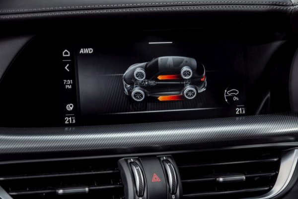 Stelvio е построен върху отличната платформа на Giulia, но е повдигнат и с по-широка следа. Базовите версии са със задно предаване, но ние тестваме Veloce, с активна трансферна кутия и възможност до 50% от въртящия момент да отива към предните колела. Това е комбинирано с много добре настроено окачване, с двойна вилка отпред и многозвенно отзад. А също и с 8-степенния автоматик на ZF, който все така няма конкуренция на пазара.