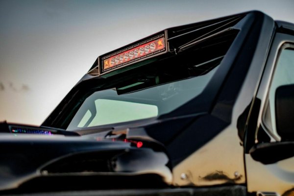 Най-специалната част на този пикап е т. нар. “Oculus Tron” предница, която има интегриран LED бар, вместо конвенционалните светлини от Gladiator, напомняйки немалко за Tesla Cybertruck. И като машина, предназначена за преживяване на апокалипсис, предлага доста специални неща като споменатата предница, с добавени масивни куки за теглене, кевларени уширители на калниците, степенки и протектор на челното стъкло, както и заключващ се капак на товарното отделение.