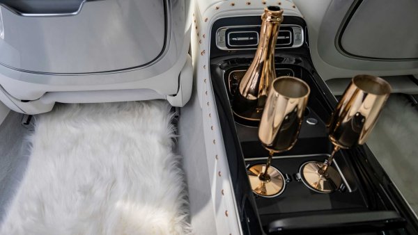 Говорейки за напата, има детайли с бяла такава буквално навсякъде, където погледнете. A от Maybach са стигнали още по-далеч като дори дискретно са дали на информационно-развлекателната система MBUX блестящи акценти от розово злато. Дори и старт бутонът е с пръстен от него, а индивидуалните кресла на втория ред разполагат със специална стойка за шампанско и възглавници от бяла изкуствена козина.
