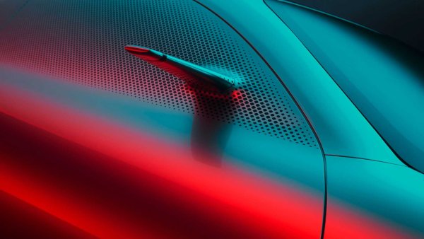 Стръмно наклонена А-колона се влива в покрив, който се стеснява надолу във форма на сълза. Рамките на прозорците, както и самите прозорци, са в същия сребрист цвят, наречен от производителя Alubeam Silver, като останалата част от каросерията. Тънки издатини, в които явно има вградени камери, служат за странични огледала на спортната машина.