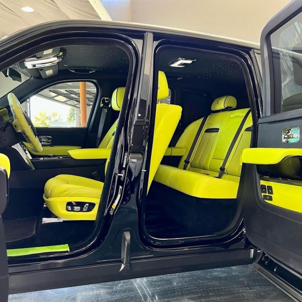 Както стана ясно, новият Cullinan е с черен екстериор, пасващ точно в черния гараж на Мейуедър, в който има още една бройка от модела, няколко Mercedes-а и други мощни коли. Различното, в случая, е интериорът в лаймово зелено, който е изработен във фабриката на Rolls-Royce. Същият цвят се вижда в логото на марката, върху колелата и спирачните апаратите.