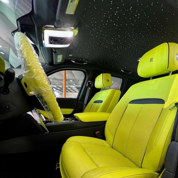 Както стана ясно, новият Cullinan е с черен екстериор, пасващ точно в черния гараж на Мейуедър, в който има още една бройка от модела, няколко Mercedes-а и други мощни коли. Различното, в случая, е интериорът в лаймово зелено, който е изработен във фабриката на Rolls-Royce. Същият цвят се вижда в логото на марката, върху колелата и спирачните апаратите.