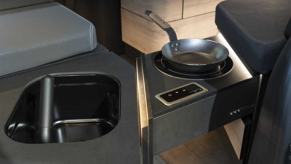 Друга седалка е разположена от лявата страна на автомобила. Инсталираната тук система от чекмеджета предлага място за съхранение на принадлежности за къмпинг. Тук ще намерите и индукционен котлон и разтегателно навън чекмедже с газова готварска печка, така че да има две възможности за готвене. От дясната страна на автомобила има сгъваема и електрически регулируема на височина маса. Тук са интегрирани и други отделения за съхранение. Цялото вътрешно оборудване трябва да може да бъде премахнато за по-малко от пет минути от двама души.