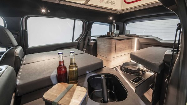 Друга седалка е разположена от лявата страна на автомобила. Инсталираната тук система от чекмеджета предлага място за съхранение на принадлежности за къмпинг. Тук ще намерите и индукционен котлон и разтегателно навън чекмедже с газова готварска печка, така че да има две възможности за готвене. От дясната страна на автомобила има сгъваема и електрически регулируема на височина маса. Тук са интегрирани и други отделения за съхранение. Цялото вътрешно оборудване трябва да може да бъде премахнато за по-малко от пет минути от двама души.