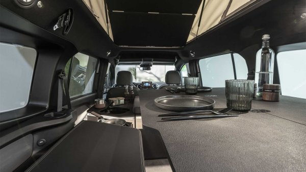 Друга седалка е разположена от лявата страна на автомобила. Инсталираната тук система от чекмеджета предлага място за съхранение на принадлежности за къмпинг. Тук ще намерите и индукционен котлон и разтегателно навън чекмедже с газова готварска печка, така че да има две възможности за готвене. От дясната страна на автомобила има сгъваема и електрически регулируема на височина маса. Тук са интегрирани и други отделения за съхранение. Цялото вътрешно оборудване трябва да може да бъде премахнато за по-малко от пет минути от двама души.