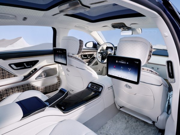 Кристално бяла кожа на седалките, конзолите и вратите потапя пътниците в лукс. Постелките са изработени от лен и мохер, таванът се отличава с повтаряща се трилъчева звезда на Mercedes .