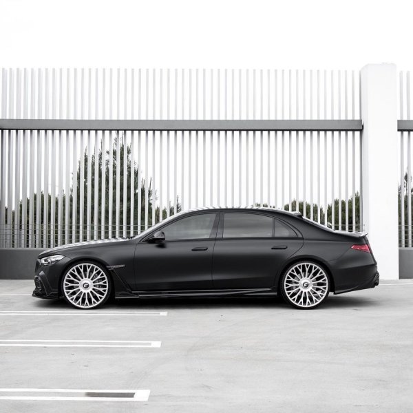 За да бъде завършен зловещият вид, тази S-Class получава черни емблеми, докато колелата осигуряват много контраст с тъмното тяло. Джантите с Y-образни спици са дело на Forgiato, като имат много по-голям диаметър от стандартните. Затъмнените прозорци прикриват случващото се в салона, където се залата на комбинация от черно и бяло.