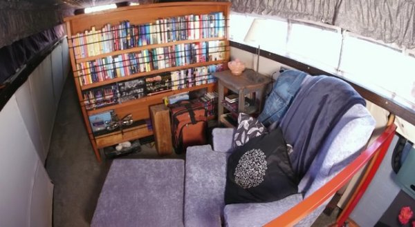 От другата страна на камиона има киносалон, в който двойката работи по своя канал в YouTube и гледа филми на 75-инчов екран, съчетан с два гигантски високоговорителя. Основният източник на отопление на първия етаж е камина на пелети. Над стълбите има и термопомпа, която помага на печката да затопли цялото пространство.