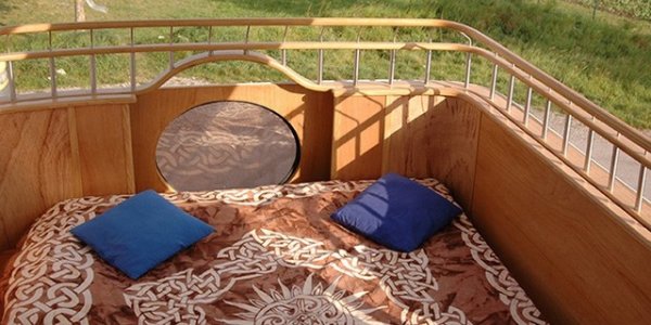 В другия край на автобуса има друга спалня, която става открита след отваряне на част от покрива, подобно на багажника на кола. Гюнтер не препоръчва да се спи на открито, но по желание тази зона може да се преустрои в тераса.