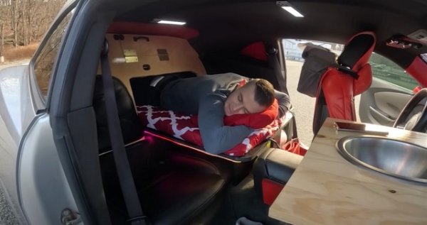 Задните седалки все още са на мястото си, но служат за различни цели. Тази зад пътническата е дневната на Арслан - мястото, от което готви и работи. Другата е място за съхранение на закуски и е напълно покритя от леглото с дължина 183 см и ширина 76 см, което минава през преграда от шперплат и се простира в багажника.