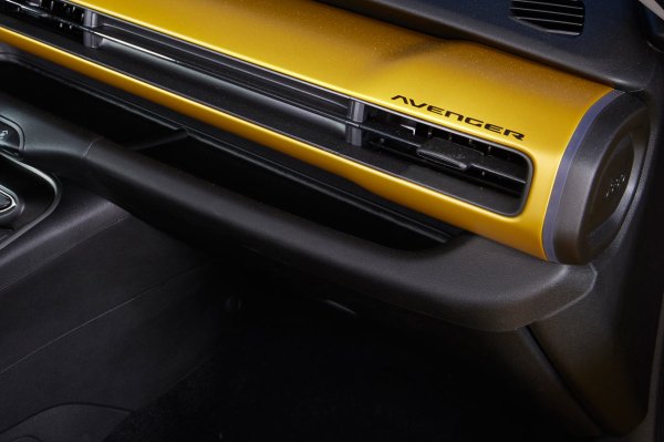 Ако погледнете края на предния панел при отворена врата, можете да прочетете името на марката. Има и няколко напомняния за това къде е проектиран Avenger - компас с координатите на Торино се издига върху пластмасова вложка в решетката на бронята, а планините, вероятно Алпите, са изобразени по контура на задното стъкло.