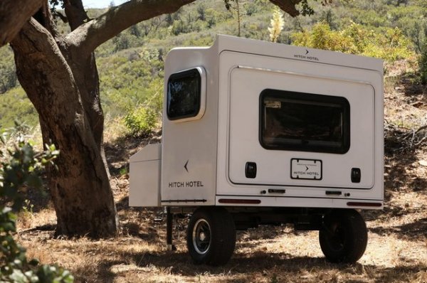 Hitch Hotel Traveller е малка и доста симпатична „кутия на колела“, създадена в Калифорния от баща и син, която дава „нощен приют“ и предлага основните неща за романтика на открито. Хотел Hitch е дълъг 1 метър в сгънато състояние, но след като се разшири телескопично с прибиращи се допълнителни модули, в него могат да спят двама възрастни. Основното предимство е, че това може да стане на всяко подходящо за спиране на теглещия автомобил място.