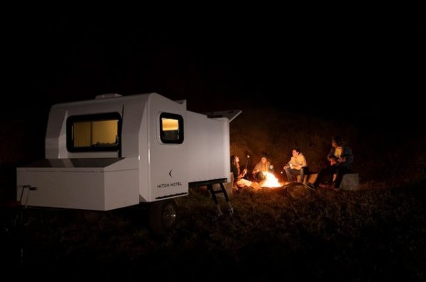 Hitch Hotel Traveller е малка и доста симпатична „кутия на колела“, създадена в Калифорния от баща и син, която дава „нощен приют“ и предлага основните неща за романтика на открито. Хотел Hitch е дълъг 1 метър в сгънато състояние, но след като се разшири телескопично с прибиращи се допълнителни модули, в него могат да спят двама възрастни. Основното предимство е, че това може да стане на всяко подходящо за спиране на теглещия автомобил място.