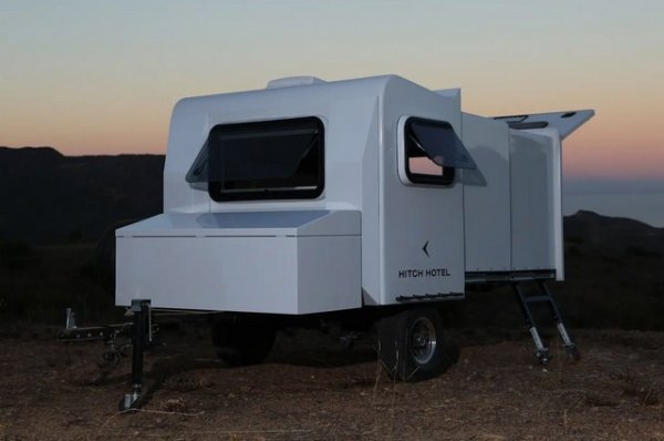 Hitch Hotel Traveller е малка и доста симпатична „кутия на колела“, създадена в Калифорния от баща и син, която дава „нощен приют“ и предлага основните неща за романтика на открито. Хотел Hitch е дълъг 1 метър в сгънато състояние, но след като се разшири телескопично с прибиращи се допълнителни модули, в него могат да спят двама възрастни. Основното предимство е, че това може да стане на всяко подходящо за спиране на теглещия автомобил място.