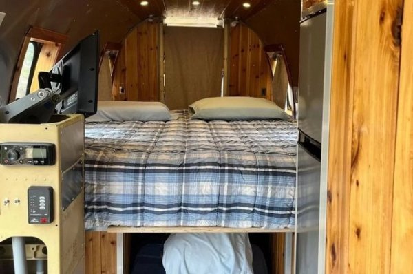 Масата за хранене е ръчно изработена, с множество слоеве епоксидна смола и е украсена със значки, монети и дори парчета от перки на хеликоптер. Банята е с истинска врата от тоалетната на стар самолет. Монтирани са също климатик и мощна аудио система.