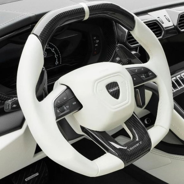 Салонът на този Urus е изцяло от бяла кожа. На волана и предния панел има вложки от въглеродни влакна под лъскав лак.