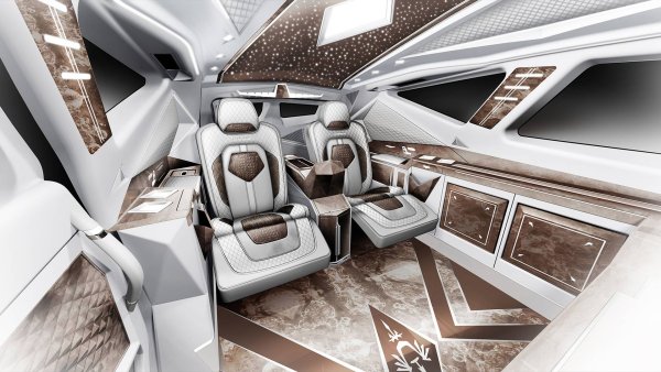 Интериорът на проекта е проектиран така, че да може да се персонализира, дори и отзад, където е възможно да се поръчат две единични седалки и да се гарантира максимален комфорт на пътниците. При желание от клиента има златни детайли, покрития от крокодилска кожа, малък хладилник и дори сейф.