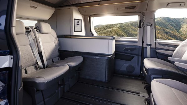 Инженерите на Volkswagen обаче са я преместили назад, за да има повече място зад предните седалки. За допълнителен ефект, индукционната печка, мивката, хладилникът и чекмеджетата вече са достъпни както отвън, така и отвътре. Включена е и газова готварска печка , както и 230-волтов щепсел отвън.