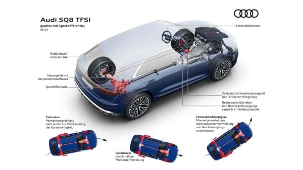 Що се отнася до SQ8 (синьото на снимките), той получава по-голям 4,0-литров V8 бензинов двигател с 500 к.с. и 770 Нм въртящ момент, позволяващи ускорение от 0 до 100 км/ч за 4,1 секунди. Тази версия получава 21-цолови, докато 22- и 23-цоловите са опция. Както при обикновеното Q8, този вариант също е с постоянно задвижване на четирите колела Quattro и 8-степенна автоматична скоростна кутия Tiptronic, която сменя предавките по-бързо при SQ8.
