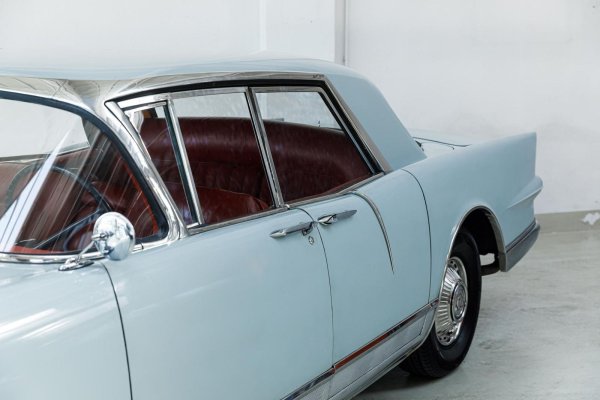 Бледосиньото лаково покритие кореспондира отлично с яркочервените кожени тапицерии на класическия интериор, в който се вижда оригинално радио Motorola и доста добре запазени дървени апликации. Иначе обявената цена за този разкошен образец на френското автомобилостроене е 180 000 евро, а пробегът е под 25 000 километра.