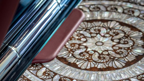 Седалките са украсени с бродирани RR монограми и розови конци. Сгъваемите маси са вдъхновени както от миди, така и от традиционни арабски шарки - всяка е украсена с 1351 отделни парчета седеф. На предния панел от орех има часовник със седеф, също изработен по поръчка, и препратка към героя на деня - арабската дума за „баща“ в центъра.