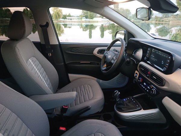 Мястото на първия ред е достатъчно дори за много високи и едри хора, а удобството на позицията на седене и цялостната ергономия са удивително добри за толкова базов автомобил. В i10 седите приятно високо, обзорът във всички посоки е чудесен, а управлението на функциите може да се случва и със затворени очи - поне образно казано.