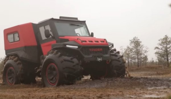 Като достоен продължител на тази традиция изглежда този много необичаен всъдеход, наречен Tinger TF4. Построен върху чупеща се ос и с корпус от специална пластмаса, той изглежда лека категория на фона на машини от миналото - докато не го видите как прегазва с лекота блата, снегове и дори преплава езера.