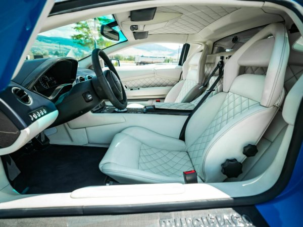 Търговецът посочва, че тази кола е изминала само 16 550 км, като е оборудвана с опционални седалки тип „кофа“, а интериорът е тапициран с бяла кожа Bianco Polar с диамантени шевове.