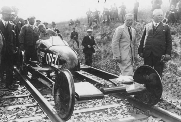 НА СНИМКАТА: Фриц фон Опел (с очилата) редом с прототипа, подобрил рекорда за скорост по релси