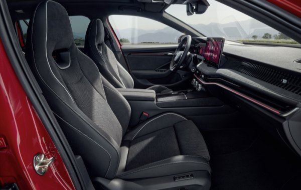 Салонът на спортните Superb се различава от другите версии на флагмана на марката. Интериорът е направен в черно, а червеното осветление добавя контраст. Предните спортни седалки с интегрирани облегалки за глава са отопляеми и имат регулируеми дължини на долните възглавници. Освен това Skoda предлага по-ергономични предни седалки с германски AGR сертификат и функция за климатичен контрол.