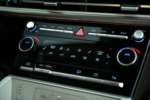 Santa Fe има пълноценна система за задвижване на четирите колела, която се казва H-Trac и която си е собствена разработка на Hyundai, заменила използваната в миналото система на BorgWarner. Имате eлектронно разпределение на въртящия момент между двете оси, имате и възможност за заключване на диференциала, но не мислете за това като за офроуд машина. При минимален просвет 177 мм, Santa Fe няма амбициите да вози ловци, риболовци и прочие. Целта е по-скоро да имате повече спокойствие по нормалните пътища.