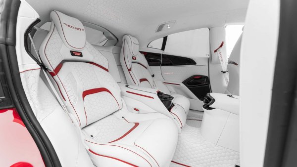 Интериорът изглежда по-добре, но не чак толкова. Перфорирана бяла кожа с червени шевове покрива почти всеки сантиметър и има изобилие от лога на Mansory. Воланът и таблото получават акценти от червени въглеродни влакна, за да съответстват на обработката на екстериора.