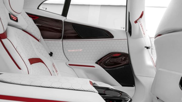 Интериорът изглежда по-добре, но не чак толкова. Перфорирана бяла кожа с червени шевове покрива почти всеки сантиметър и има изобилие от лога на Mansory. Воланът и таблото получават акценти от червени въглеродни влакна, за да съответстват на обработката на екстериора.