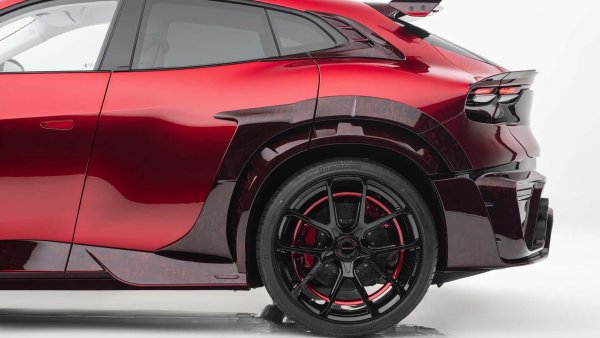 Колелата с олекотени лети джанти FC.5 на Mansory с размери 22 цола отпред и 23 цола отзад. Ярко черни акценти и тапицерията от мраморни въглеродни влакна определено не помагат на това Purosangue да изглежда по-добре, като единствено боята Vermillion Red прави нещата по-поносими.