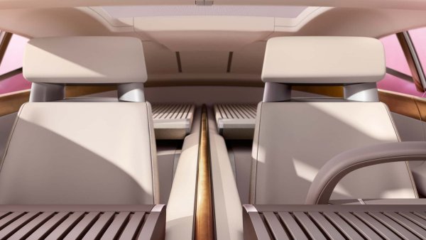 Jaguar нарича този език на дизайна Exuberant Modernism, като залага на същото в интериора. Плоските предни седалки са разполовени от месингова преграда. Няма видими инструменти или контроли, а вместо това има два големи екрана, който се въртят - по един от всяка страна. Това е изключително минималистично, макар и малко странно, и става още по-странно, когато видите материалите, използвани за интериора. Освен смес от вълна, „вдъхновена от ръчно тъкани прежди“, седалките и централната преграда са направени от травертин, което всъщност е камък.