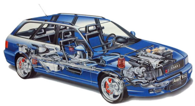 Audi RS2 Avant е практичен спортен автомобил за всякакви атмосферни условия, който може да носи багаж и да се конкурира с всяко бързо купе. Има надлъжно монтиран редови петцилиндров 2,2-литров двигател с турбокомпресор. Агрегатът е модифициран от Porsche и произвежда 315 к.с., което е повече от прилично за тогавашните стандарти. Шестстепенна ръчна скоростна кутия и система за задвижване на всички колела с междуосен диференциал с ограничено приплъзване Torsen допълват образа на универсален боец на този модел.