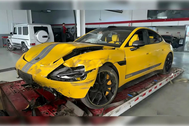 По време на инцидента на пистата въздушните възглавници на електрическата кола са се отворили, така че водачът не е пострадал сериозно. Но самата кола нямаше късмет - предната е потрошена, особено левият фар и капакът.