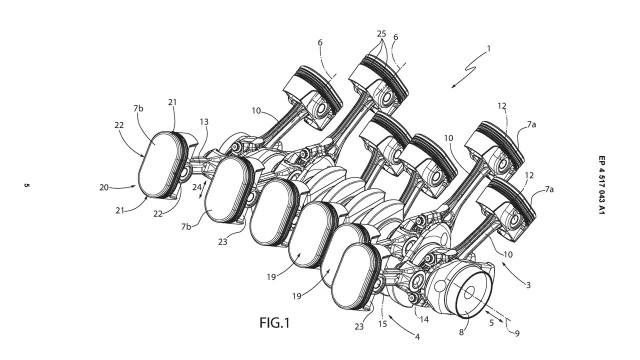 За да направи конструкцията още по-малка, патентът на Ferrari включва нов дизайн на коляновия вал и мотовилката. Вместо обичайния един прът на бутало, свързан с един лагер на манивелата, този дизайн ще позволи на две бутала, разположени едно срещу друго, да използват една и съща шийка на коляновия вал. Това може да направи производството по-лесно, да намали триенето и да направи двигателя още по-къс.