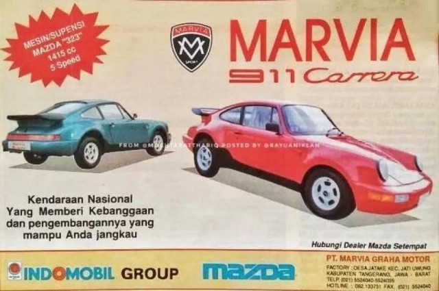 Това е индонезийският модел Marvia 911 - серийна, колкото и странно да ви звучи, реплика на Porsche 964, произведена в тираж от около 50 екземпляра. Още по-невероятното е, че производителят - местната компания Indomobil, ги продава в собствения си дилърски център, докато същевременно се опитва да убеди Porsche да й позволи да произвежда и реализира истински 911.