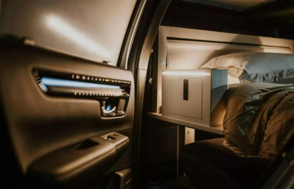 Основният инструмент за трансформацията е модулът Egoe Nestboard 650, инсталиран в багажника. В комбинация с разтегателния заден диван той ви позволява да организирате просторна зона за спане, а в модула също така са интегрирани кухненска печка, сгъваема мивка и място за съхранение на съдове.
