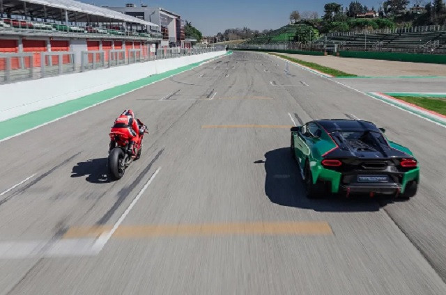 Тестът изискваше от водача на Temerario да активира Launch Control, достъпен чрез бутон с кариран флаг на волана. Не знаем на колко метра от старта е била поставена финалната линия, но подозираме, че може да е имало някакво джентълменско споразумение. И тя да се намира точно там, където Ducati настига Lamborghini, което в първите няколко метра сякаш печели няколко метра преднина.