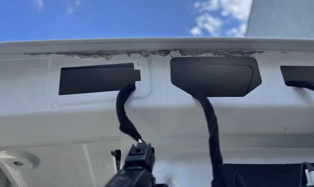 Канадецът публикува и снимка, на което се вижда, че на задната врата в близост до камерата за заден ход има малки участъци от ръжда и парчета боя, които са започнали да се лющят и падат. При по-внимателно вглеждане може да се забележат и някои мехурчета в боята.