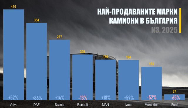 При разцвета на строителния бизнес в България и добре развиващите се играчи в сектора на далечните превози у нас, едва ли е изненада, че търсенето на камиони расте. За първото полугодие на 2025 са регистрирани 1807 нови тежки камиона, което е ръст от 15% спрямо същия период на миналата година. Настъпили са обаче и сериозни размествания при най-популярните марки. Volvo си остава на върха със завидния ръст от 52% на годишна база, но Mercedes, който бе на второ място през 2024, сега се смъква цели пет позиции надолу, с 42% спад. Свили са се също продажбите на Renault (-13%, от трето на четвърто място) и на Ford (-65%). Като основен печеливш тази година се очертава нидерландската DAF, с 86% увеличение в регистрациите и изкачване от пета до втора позиция. Стабилен растеж отчитат Scania, MAN и особено Iveco.