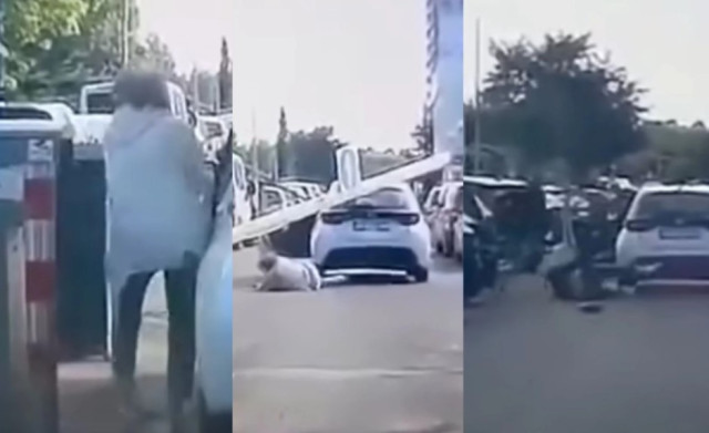 Жената успява да настигне колата, отваря вратата и се опитва да влезе вътре, за да натисне спирачката. Ситуацията обаче излиза извън контрол и шофьорката пада на земята, като лявото задно колело преминава през краката й. За нейно щастие, натоварването на задния мост на хечбека е по-малко в сравнение с предния, където се намира двигателя. Жената се изправя и накуцвайки, продължава преследването на бягащата Toyota Yaris.