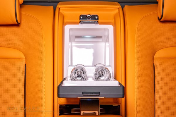 Отзад има голям телевизор, придружен от два допълнителни екрана, комплект масички за пикник, аналогов часовник и две комфортни индивидуални седалки (тип "капитански столове"), разделени от голяма конзола по средата. Други акценти включват седалки с подгряване, охлаждане и масаж, електрическо регулиране с памет, таван "звездно небе", затъмнени стъкла за уединение, амбиентно осветление и много наситена, яркооранжева кожена тапицерия. Има също стелки от агнешка вълна, обичайното автоматично затваряне на вратите, аудио система по поръчка, DAB тунер, системата Active Guard и още много екстри.