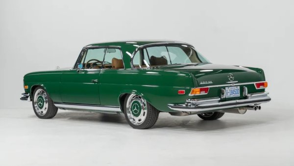 Отвън това е класически Mercedes W111, което означава, че е един от най-красивите луксозни автомобили, създавани някога от човешка ръка. От компанията са го боядисали в зелено, монтирали са джанти тип bullet, реставрирали са всички хромирани детайли и са го излъскали, за да блести безупречно.