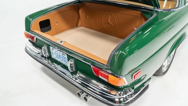 Отвън това е класически Mercedes W111, което означава, че е един от най-красивите луксозни автомобили, създавани някога от човешка ръка. От компанията са го боядисали в зелено, монтирали са джанти тип bullet, реставрирали са всички хромирани детайли и са го излъскали, за да блести безупречно.